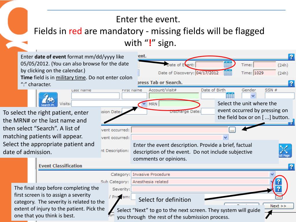 Enter the event. Fields in red are mandatory - missing fields will be flaggedwith “!” sign. Enter date of event format mm/dd/yyyy like 05/05/2012. (You can also browse for the date by clicking on the calendar.) Time field is in military time. Do not enter colon “:” character. Select the unit where the event occurred by pressing on the field box or on [ ...] button. To select the right patient, enter the MRN# or the last name and then select “Search”. A list of matching patients will appear. Select the appropriate patient and date of admission. Enter the event description. Provide a brief, factual description of the event. Do not include subjective comments or opinions. The final step before completing the first screen is to assign a severity category. The severity is related to the extent of injury to the patient. Pick the one that you think is best. Select for definition Select “Next” to go to the next screen. They system will guide you through the rest of the submission process.