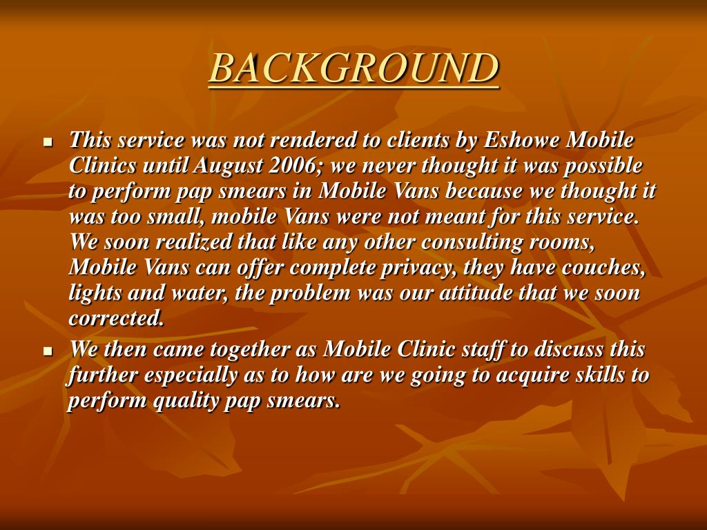 BACKGROUND • This service was not rendered to clients by Eshowe Mobile Clinics until August 2006; we never thought it was possible to perform pap smears in Mobile Vans because we thought it was too small, mobile Vans were not meant for this service. We soon realized that like any other consulting rooms, Mobile Vans can offer complete privacy, they have couches, lights and water, the problem was our attitude that we soon corrected. • We then came together as Mobile Clinic staff to discuss this further especially as to how are we going to acquire skills to perform quality pap smears.