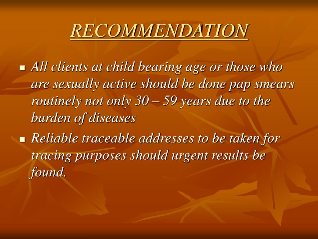RECOMMENDATION • All clients at child bearing age or those who are sexually active should be done pap smears routinely not only 30 – 59 years due to the burden of diseases • Reliable traceable addresses to be taken for tracing purposes should urgent results be found.