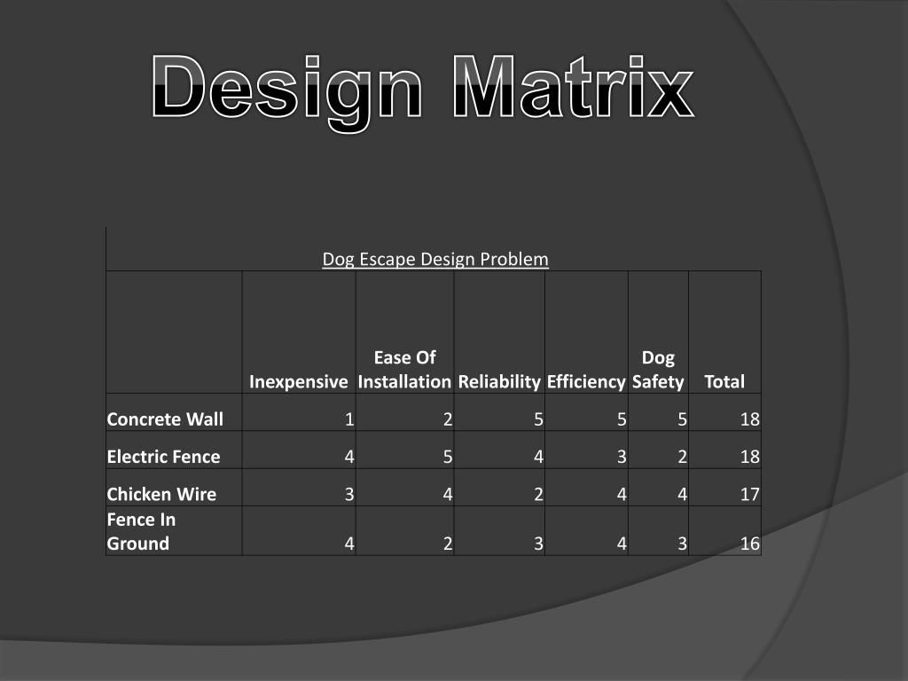 Constraints • The product must be affordable to most customers. • Must be reliable to handle the job and prevent it from happening again. • Must be able to have somewhat of an easy installation and not require too much labor. • Must not harm the dog in any kind of way. Be healthy for the dog. • Needs to be appealing to the eye if visible. Unless object is put in the ground.