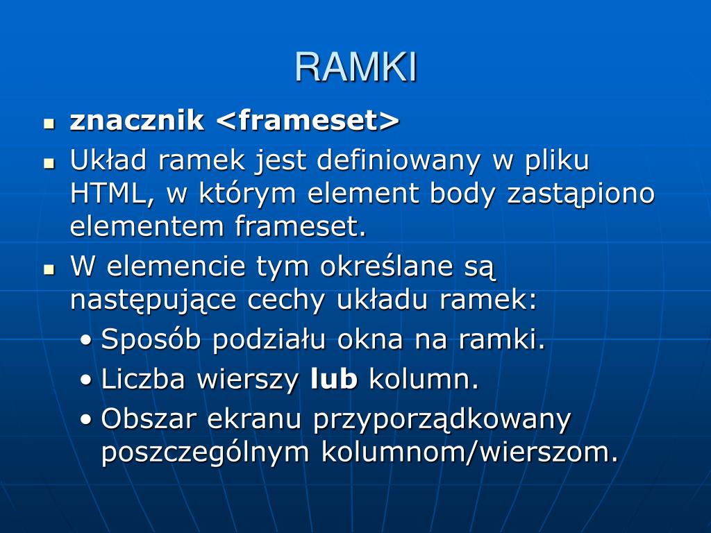 RAMKI • znacznik <frameset> • Układ ramek jest definiowany w pliku HTML, w którym element body zastąpiono elementem frameset. • W elemencie tym określane są następujące cechy układu ramek: • Sposób podziału okna na ramki. • Liczba wierszy lub kolumn. • Obszar ekranu przyporządkowany poszczególnym kolumnom/wierszom.
