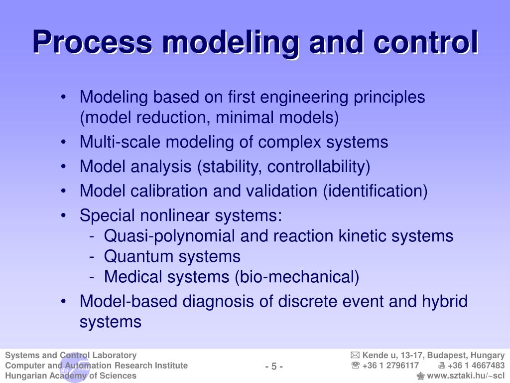 Process modeling and control • Modeling based on first engineering principles(model reduction, minimal models) • Multi-scale modeling of complex systems • Model analysis (stability, controllability) • Model calibration and validation (identification) • Special nonlinear systems: - Quasi-polynomial and reaction kinetic systems - Quantum systems - Medical systems (bio-mechanical) • Model-based diagnosis of discrete event and hybrid systems