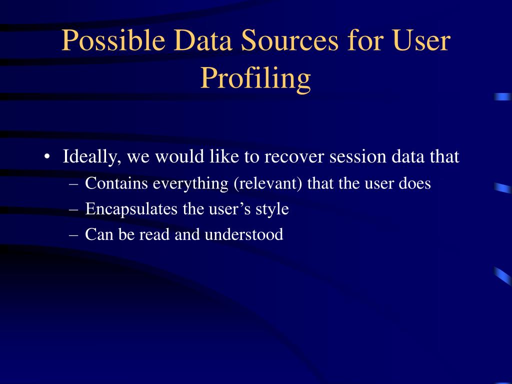 Possible Data Sources for User Profiling • Ideally, we would like to recover session data that • Contains everything (relevant) that the user does • Encapsulates the user’s style • Can be read and understood