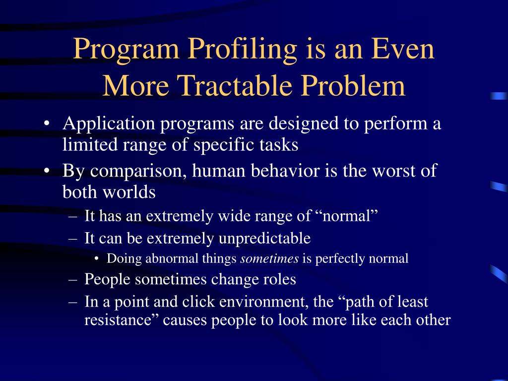Program Profiling is an Even More Tractable Problem • Application programs are designed to perform a limited range of specific tasks • By comparison, human behavior is the worst of both worlds • It has an extremely wide range of “normal” • It can be extremely unpredictable • Doing abnormal things sometimes is perfectly normal • People sometimes change roles • In a point and click environment, the “path of least resistance” causes people to look more like each other