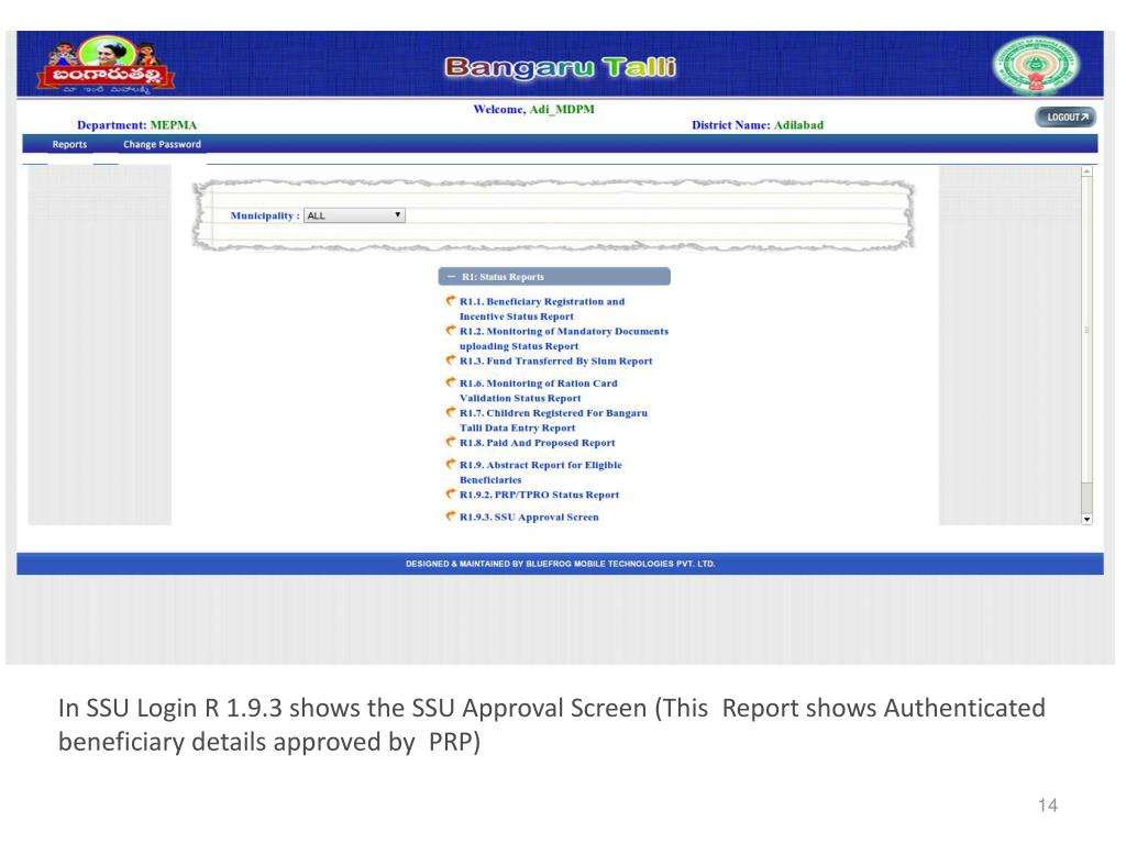 In SSU Login R 1.9.3 shows the SSU Approval Screen (This Report shows Authenticated beneficiary details approved by PRP) 14