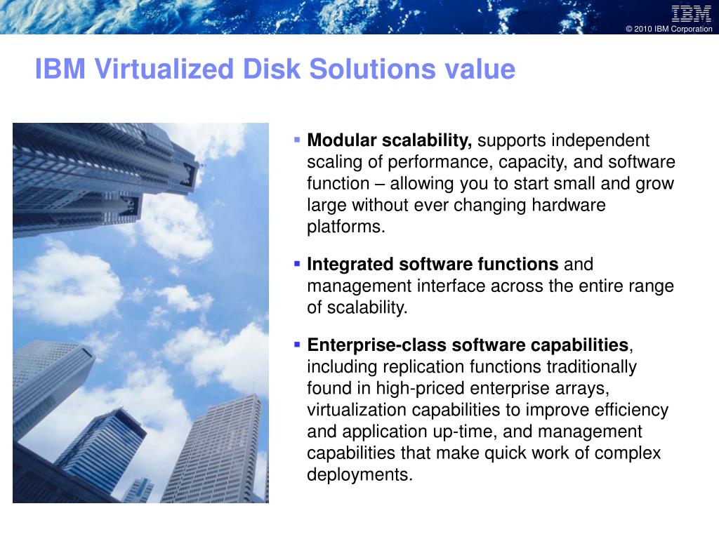 IBM Virtualized Disk Solutions value • Modular scalability, supports independent scaling of performance, capacity, and software function – allowing you to start small and grow large without ever changing hardware platforms. • Integrated software functions andmanagement interface across the entire range of scalability. • Enterprise-class software capabilities, including replication functions traditionally found in high-priced enterprise arrays, virtualization capabilities to improve efficiency and application up-time, and management capabilities that make quick work of complex deployments.