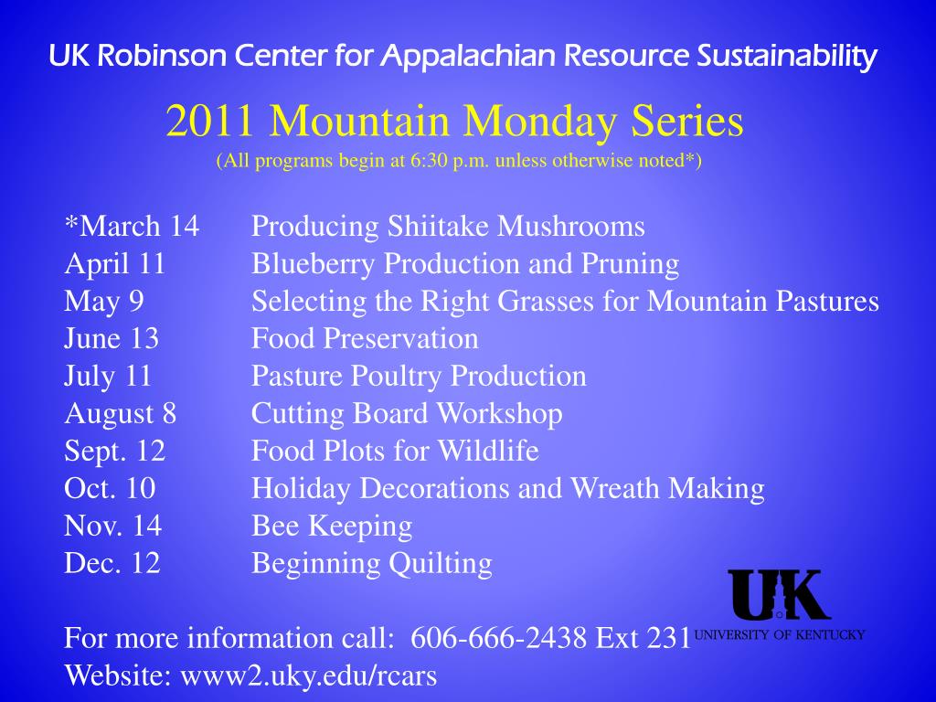 UK Robinson Center for Appalachian Resource Sustainability 2011 Mountain Monday Series (All programs begin at 6:30 p.m. unless otherwise noted*) *March 14 Producing Shiitake Mushrooms April 11 Blueberry Production and Pruning May 9 Selecting the Right Grasses for Mountain Pastures June 13 Food Preservation July 11 Pasture Poultry Production August 8 Cutting Board Workshop Sept. 12 Food Plots for Wildlife Oct. 10 Holiday Decorations and Wreath Making Nov. 14 Bee Keeping Dec. 12 Beginning Quilting For more information call: 606-666-2438 Ext 231 Website: www2.uky.edu/rcars