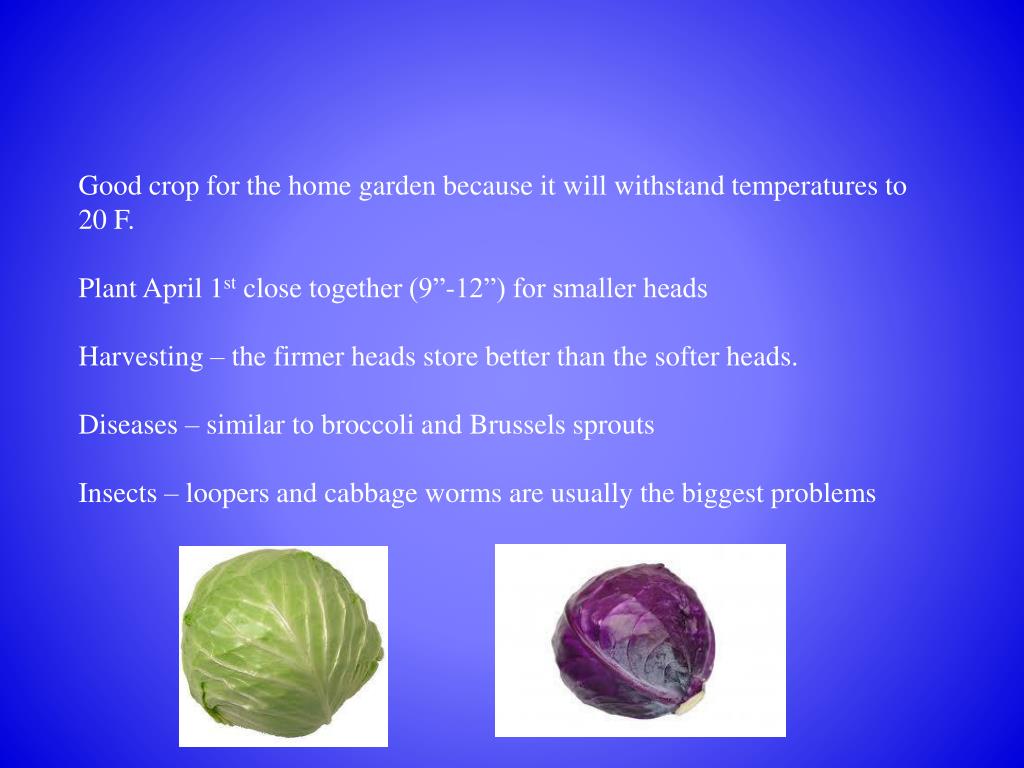 Good crop for the home garden because it will withstand temperatures to 20 F. Plant April 1st close together (9”-12”) for smaller heads Harvesting – the firmer heads store better than the softer heads. Diseases – similar to broccoli and Brussels sprouts Insects – loopers and cabbage worms are usually the biggest problems
