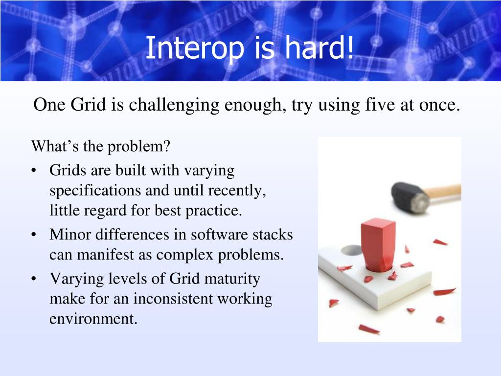 Interop is hard! What’s the problem? • Grids are built with varying specifications and until recently, little regard for best practice. • Minor differences in software stacks can manifest as complex problems. • Varying levels of Grid maturity make for an inconsistent working environment. One Grid is challenging enough, try using five at once.