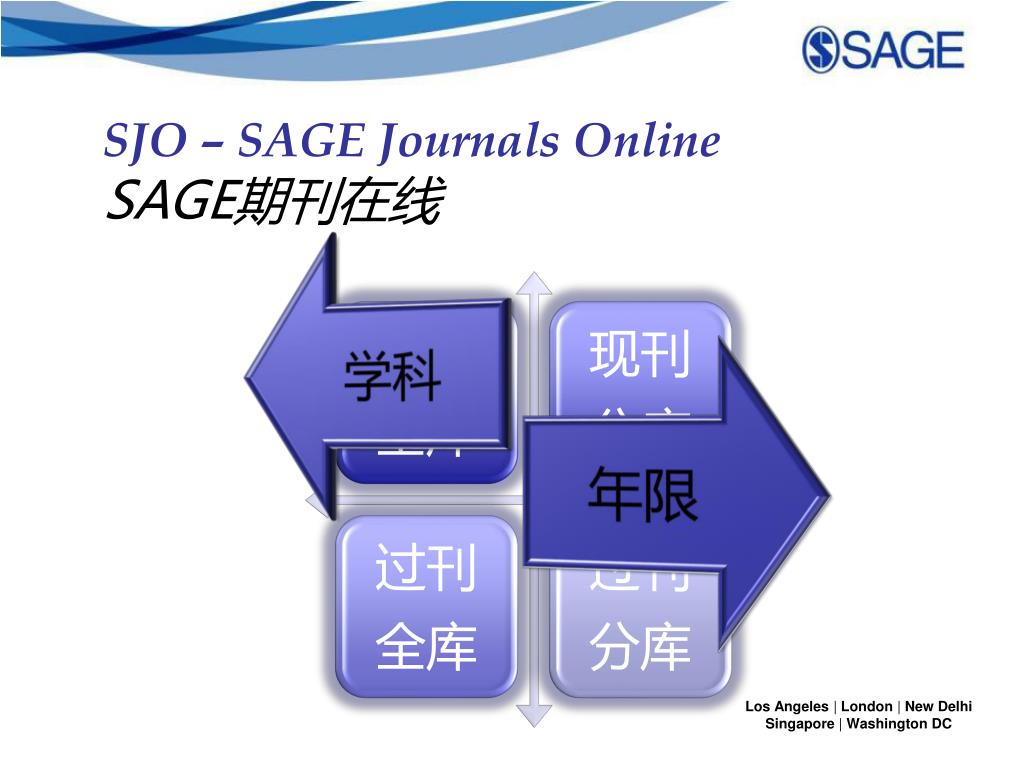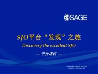 SJO 平台“发现”之旅 Discovery the excellent SJO — 平台培训 —. What we will dis cover ?. 发现 -> 高品质的学术资源 发现 -> 强大的平台功能. 100% 专注于学术和教育出版 全球排名第五位的学术出版商 宗旨:著者、编辑及协会的天然家园 超过 250 家知名学协会及研究机构合作出版 未来将由多家教育慈善机构共同监管. SAGE – a different kind of publisher 与众不同的出版者.