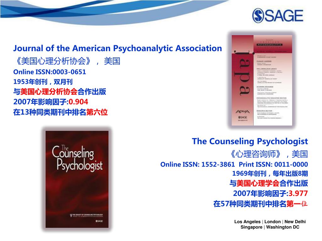 Journal of the American Psychoanalytic Association 《美国心理分析协会》,美国 Online ISSN:0003-0651 1953年创刊,双月刊 与美国心理分析协会合作出版 2007年影响因子:0.904 在13种同类期刊中排名第六位 The Counseling Psychologist 《心理咨询师》,美国 Online ISSN: 1552-3861 Print ISSN: 0011-0000 1969年创刊,每年出版8期 与美国心理学会合作出版 2007年影响因子:3.977 在57种同类期刊中排名第一位