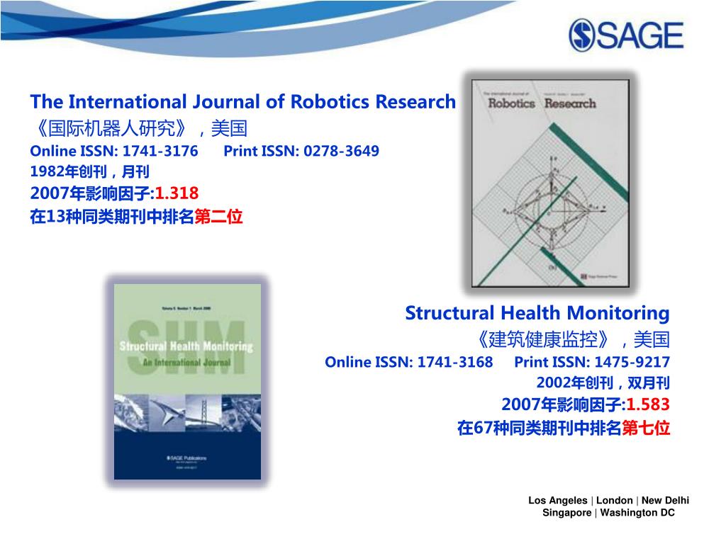 The International Journal of Robotics Research 《国际机器人研究》,美国 Online ISSN: 1741-3176 Print ISSN: 0278-3649 1982年创刊,月刊 2007年影响因子:1.318 在13种同类期刊中排名第二位 Structural Health Monitoring 《建筑健康监控》,美国 Online ISSN: 1741-3168 Print ISSN: 1475-9217 2002年创刊,双月刊 2007年影响因子:1.583 在67种同类期刊中排名第七位