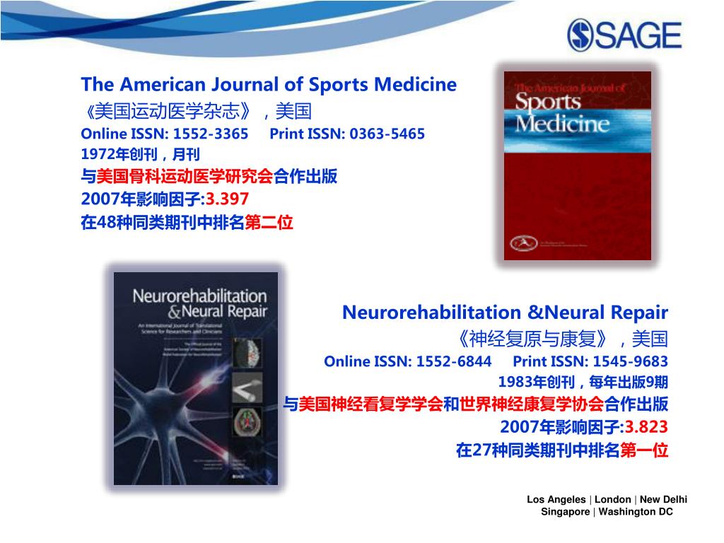 The American Journal of Sports Medicine 《美国运动医学杂志》,美国 Online ISSN: 1552-3365 Print ISSN: 0363-5465 1972年创刊,月刊 与美国骨科运动医学研究会合作出版 2007年影响因子:3.397 在48种同类期刊中排名第二位 Neurorehabilitation &Neural Repair 《神经复原与康复》,美国 Online ISSN: 1552-6844 Print ISSN: 1545-9683 1983年创刊,每年出版9期 与美国神经看复学学会和世界神经康复学协会合作出版 2007年影响因子:3.823 在27种同类期刊中排名第一位