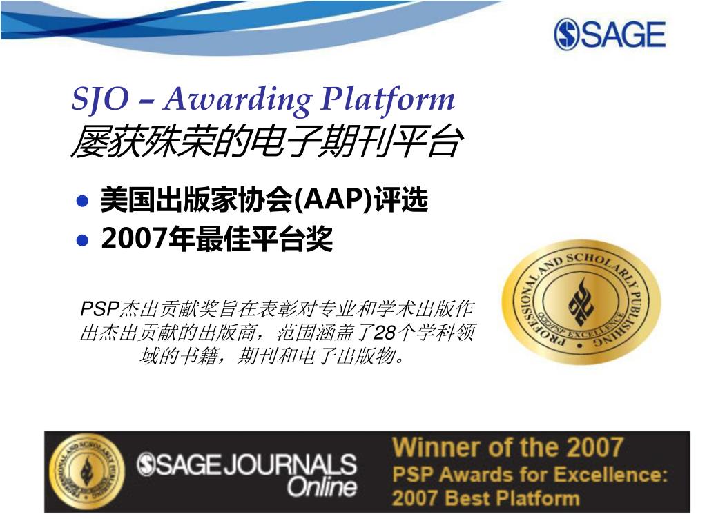 SJO – Awarding Platform 屡获殊荣的电子期刊平台 • 美国出版家协会(AAP)评选 • 2007年最佳平台奖 PSP杰出贡献奖旨在表彰对专业和学术出版作出杰出贡献的出版商,范围涵盖了28个学科领域的书籍,期刊和电子出版物。