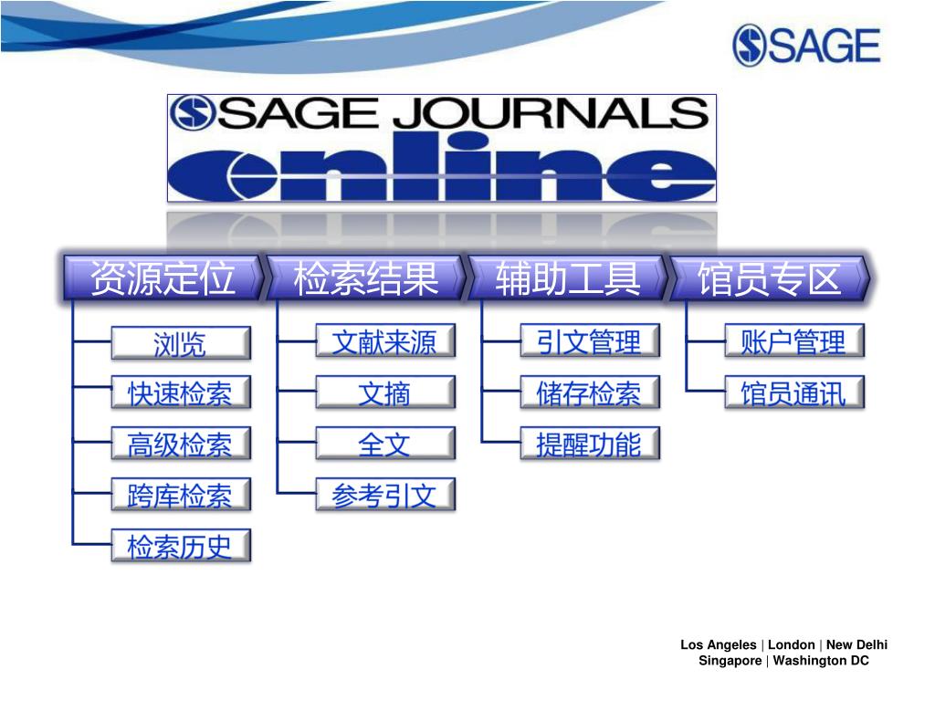 SAGE – global publishing excellence全球化的卓越出版 • 超过520种的高品质学术期刊 • 388种社会科学和人文期刊 • 165种健康科学期刊 • 34种工程及材料科学期刊 • 超过期刊总数的50%为学协会和研究机构官方刊物 • 每年出版超过700种学术专业专著,12-15种参考工具书