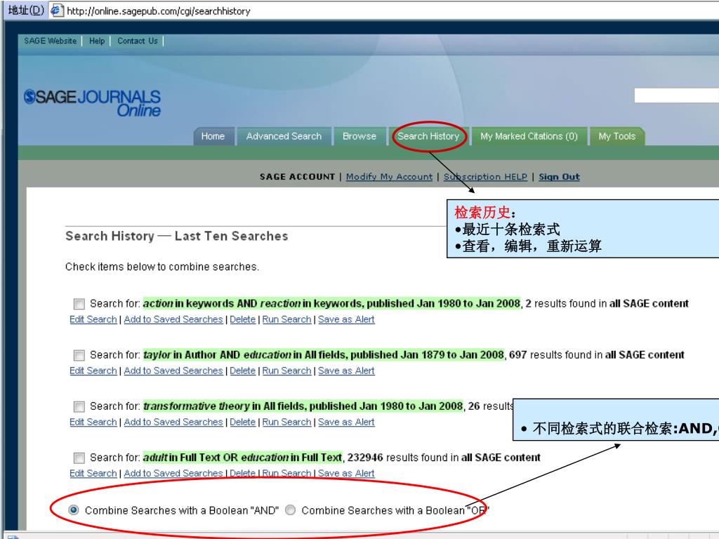 检索历史: • 最近十条检索式 • 查看,编辑,重新运算 • 不同检索式的联合检索:AND,OR