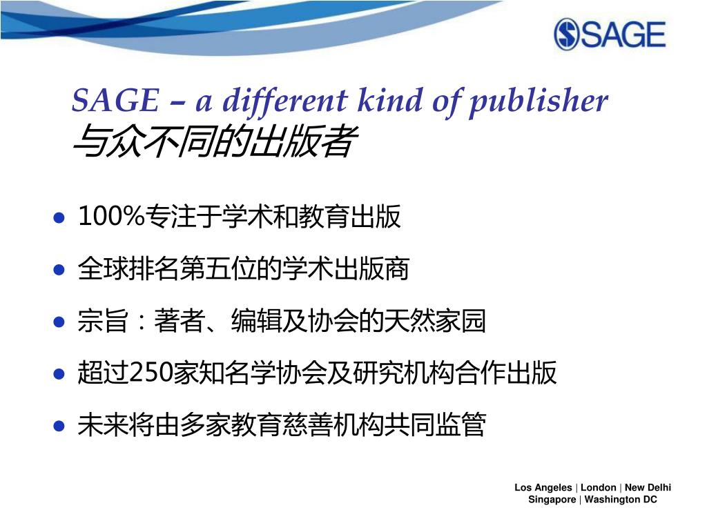 100%专注于学术和教育出版 全球排名第五位的学术出版商 宗旨:著者、编辑及协会的天然家园 超过250家知名学协会及研究机构合作出版 未来将由多家教育慈善机构共同监管 SAGE– a different kind of publisher与众不同的出版者