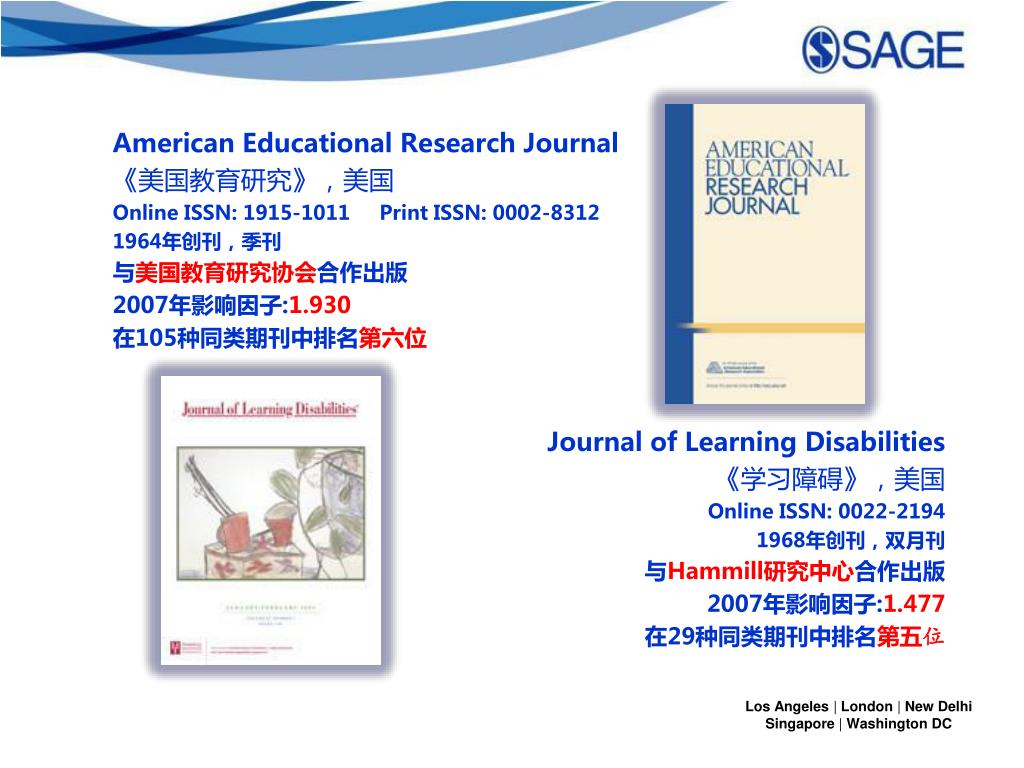 American Educational Research Journal 《美国教育研究》,美国 Online ISSN: 1915-1011 Print ISSN: 0002-8312 1964年创刊,季刊 与美国教育研究协会合作出版 2007年影响因子:1.930 在105种同类期刊中排名第六位 Journal of Learning Disabilities 《学习障碍》,美国 Online ISSN: 0022-2194 1968年创刊,双月刊 与Hammill研究中心合作出版 2007年影响因子:1.477 在29种同类期刊中排名第五位