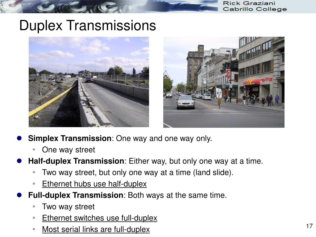 Duplex Transmissions • Simplex Transmission: One way and one way only. • One way street • Half-duplex Transmission: Either way, but only one way at a time. • Two way street, but only one way at a time (land slide). • Ethernet hubs use half-duplex • Full-duplex Transmission: Both ways at the same time. • Two way street • Ethernet switches use full-duplex • Most serial links are full-duplex