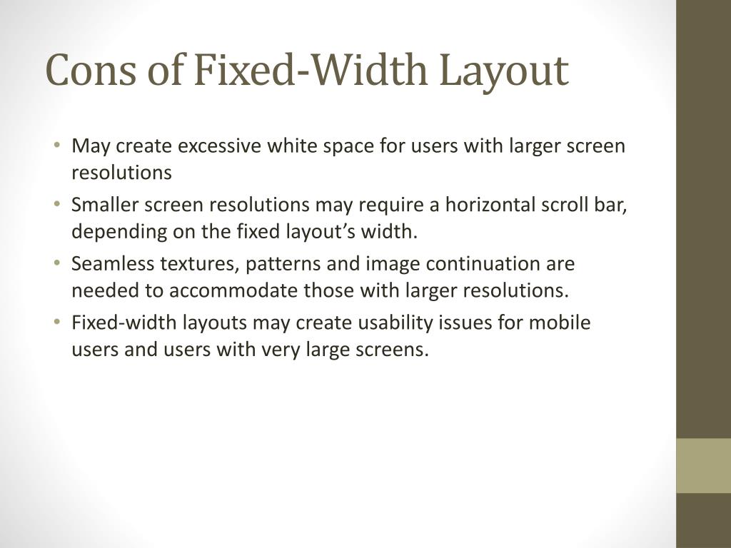 Cons of Fixed-Width Layout • May create excessive white space for users with larger screen resolutions • Smaller screen resolutions may require a horizontal scroll bar, depending on the fixed layout’s width. • Seamless textures, patterns and image continuation are needed to accommodate those with larger resolutions. • Fixed-width layouts may create usabilityissues for mobile users and users with very large screens.