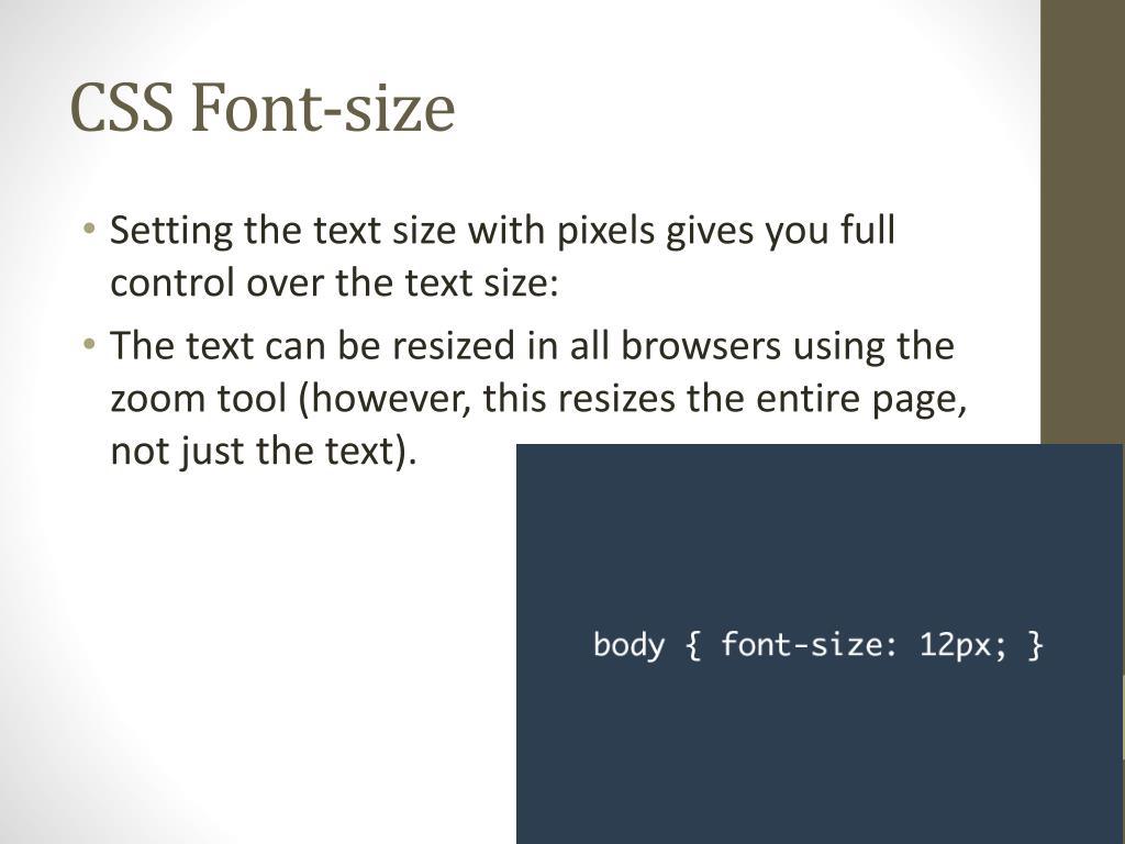 CSS Font-size • Setting the text size with pixels gives you full control over the text size: • The text can be resized in all browsers using the zoom tool (however, this resizes the entire page, not just the text).