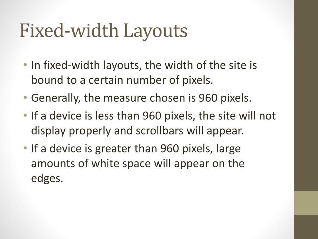 Fixed-width Layouts • In fixed-width layouts, the width of the site is bound to a certain number of pixels. • Generally, the measure chosen is 960 pixels. • If a device is less than 960 pixels, the site will not display properly and scrollbars will appear. • If a device is greater than 960 pixels, large amounts of white space will appear on the edges.