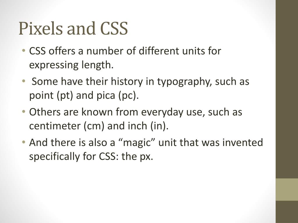 Pixels and CSS • CSS offers a number of different units for expressing length. • Some have their history in typography, such as point (pt) and pica (pc). • Others are known from everyday use, such as centimeter (cm) and inch (in). • And there is also a “magic” unit that was invented specifically for CSS: the px.