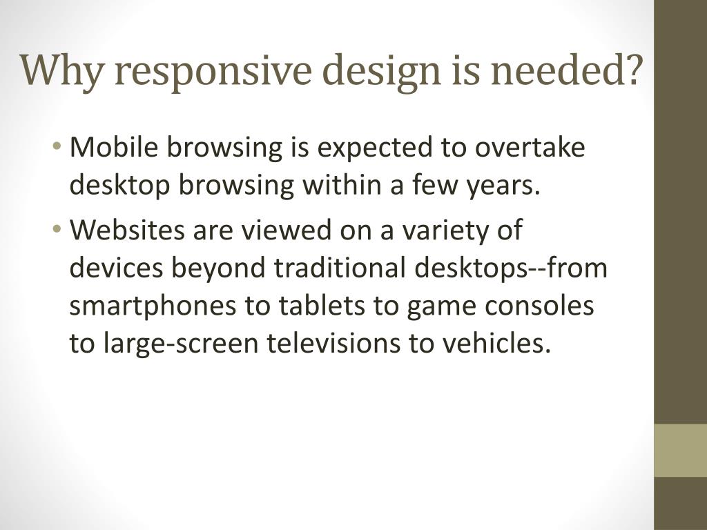 Why responsive design is needed? • Mobile browsing is expected to overtake desktop browsing within a few years. • Websites are viewed on a variety of devices beyond traditional desktops--from smartphones to tablets to game consoles to large-screen televisions to vehicles.