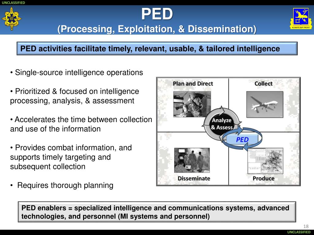 PED (Processing, Exploitation, & Dissemination) PED activities facilitate timely, relevant, usable, & tailored intelligence • Single-source intelligence operations • Prioritized & focused on intelligence processing, analysis, & assessment • Accelerates the time between collection and use of the information • Provides combat information, and supports timely targeting and subsequent collection • Requires thorough planning PED enablers = specialized intelligence and communications systems, advanced technologies, and personnel (MI systems and personnel)