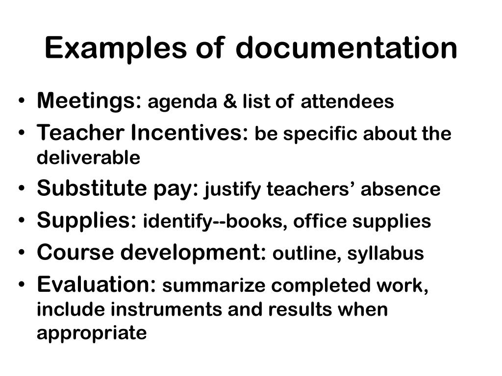 Examples of documentation • Meetings: agenda & list of attendees • Teacher Incentives: be specific about the deliverable • Substitute pay: justify teachers’ absence • Supplies: identify--books, office supplies • Course development: outline, syllabus • Evaluation: summarize completed work, include instruments and results when appropriate