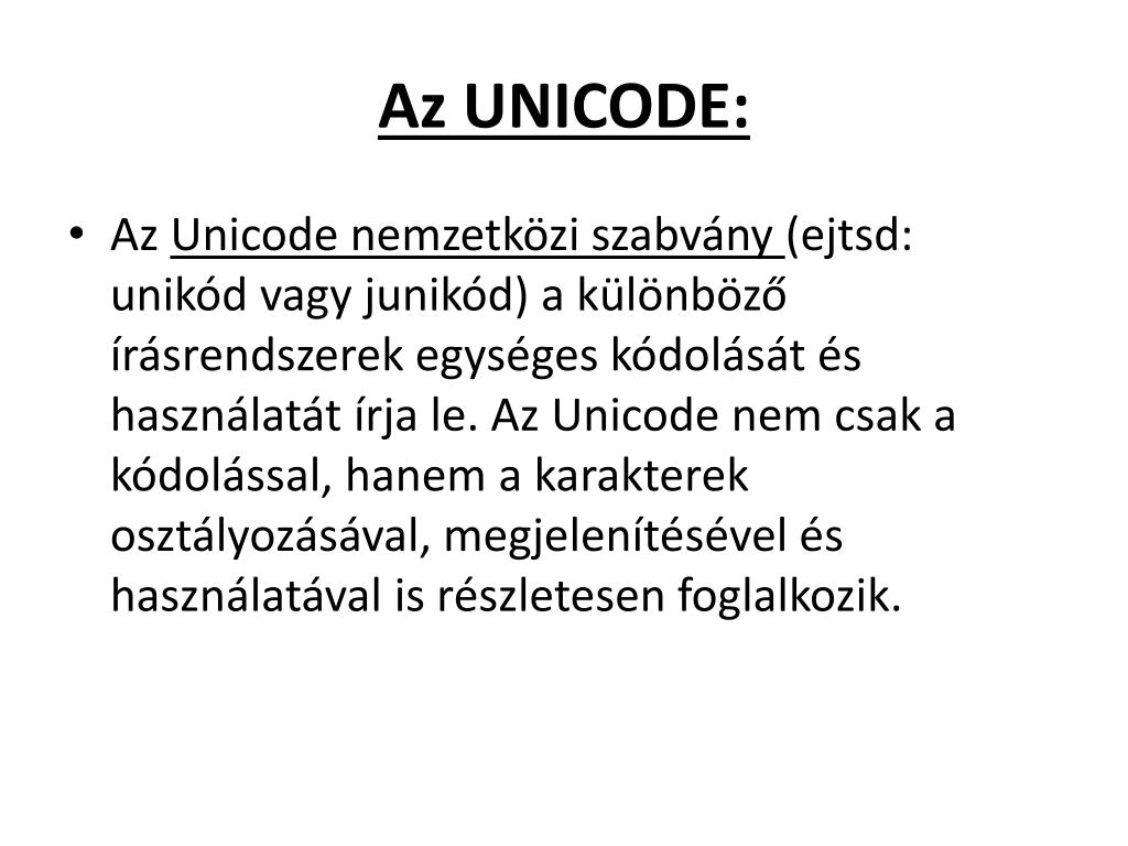 Az UNICODE: • Az Unicode nemzetközi szabvány (ejtsd: unikód vagy junikód) a különböző írásrendszerek egységes kódolását és használatát írja le. Az Unicode nem csak a kódolással, hanem a karakterek osztályozásával, megjelenítésével és használatával is részletesen foglalkozik.