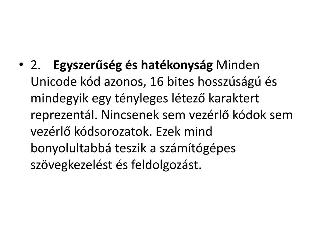 2. Egyszerűség és hatékonyság Minden Unicode kód azonos, 16 bites hosszúságú és mindegyik egy tényleges létező karaktert reprezentál. Nincsenek sem vezérlő kódok sem vezérlő kódsorozatok. Ezek mind bonyolultabbá teszik a számítógépes szövegkezelést és feldolgozást.