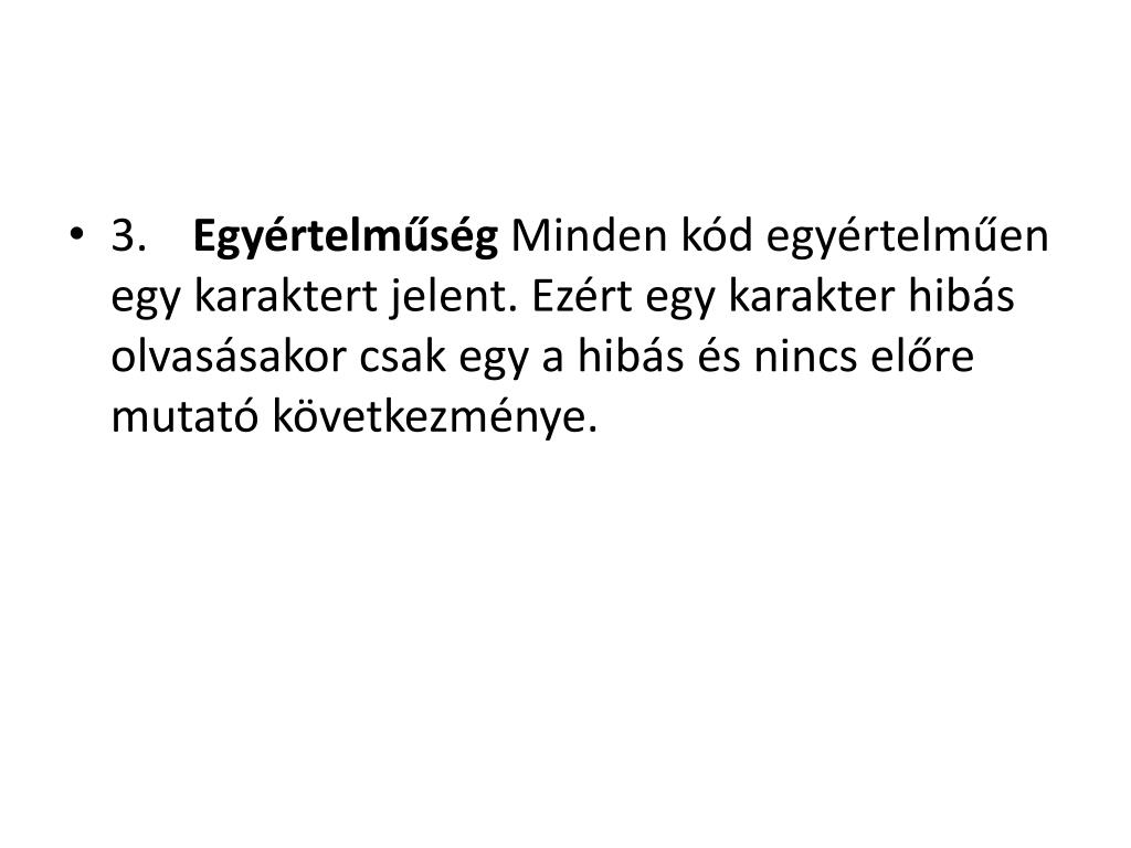 3. Egyértelműség Minden kód egyértelműen egy karaktert jelent. Ezért egy karakter hibás olvasásakor csak egy a hibás és nincs előre mutató következménye.