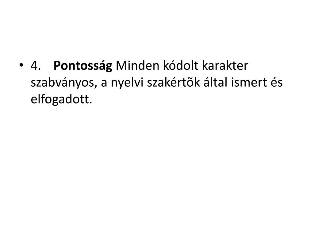4. Pontosság Minden kódolt karakter szabványos, a nyelvi szakértõk által ismert és elfogadott.