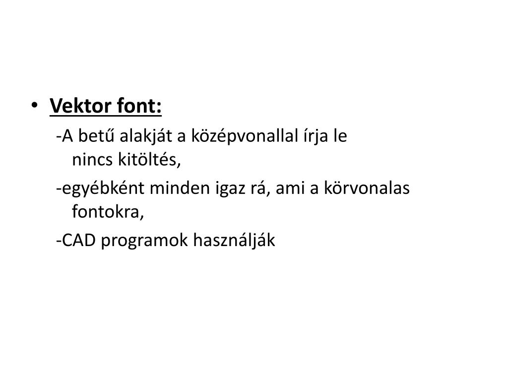 Vektor font: -A betű alakját a középvonallal írja lenincs kitöltés, -egyébként minden igaz rá, ami a körvonalas fontokra, -CAD programok használják