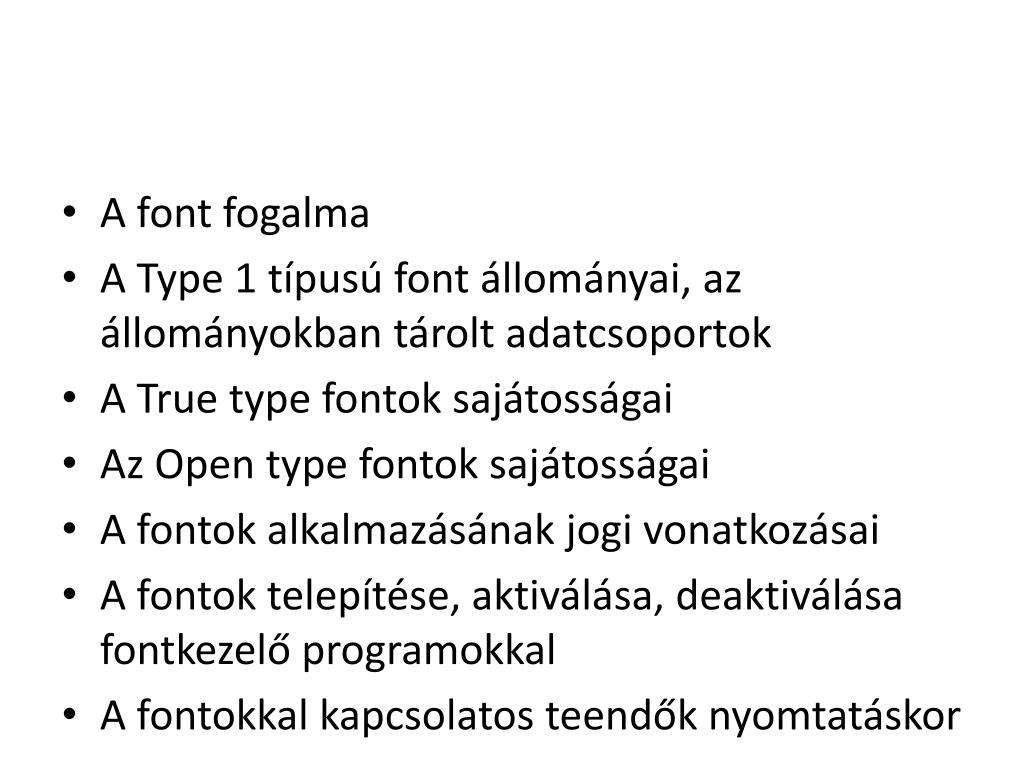 A font fogalma • A Type 1 típusú font állományai, az állományokban tárolt adatcsoportok • A True type fontok sajátosságai • Az Open type fontok sajátosságai • A fontok alkalmazásának jogi vonatkozásai • A fontok telepítése, aktiválása, deaktiválása fontkezelő programokkal • A fontokkal kapcsolatos teendők nyomtatáskor