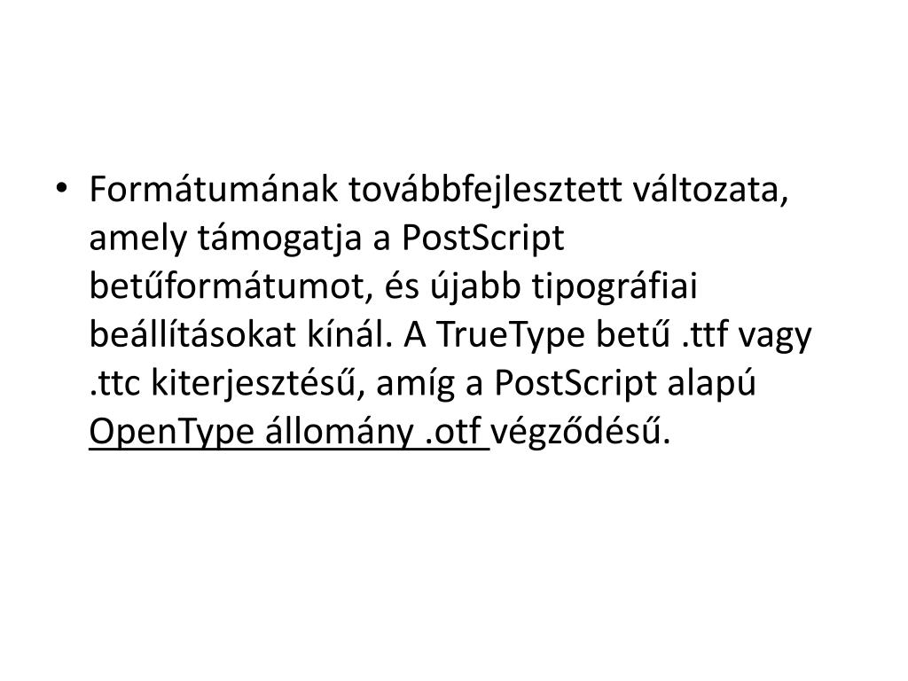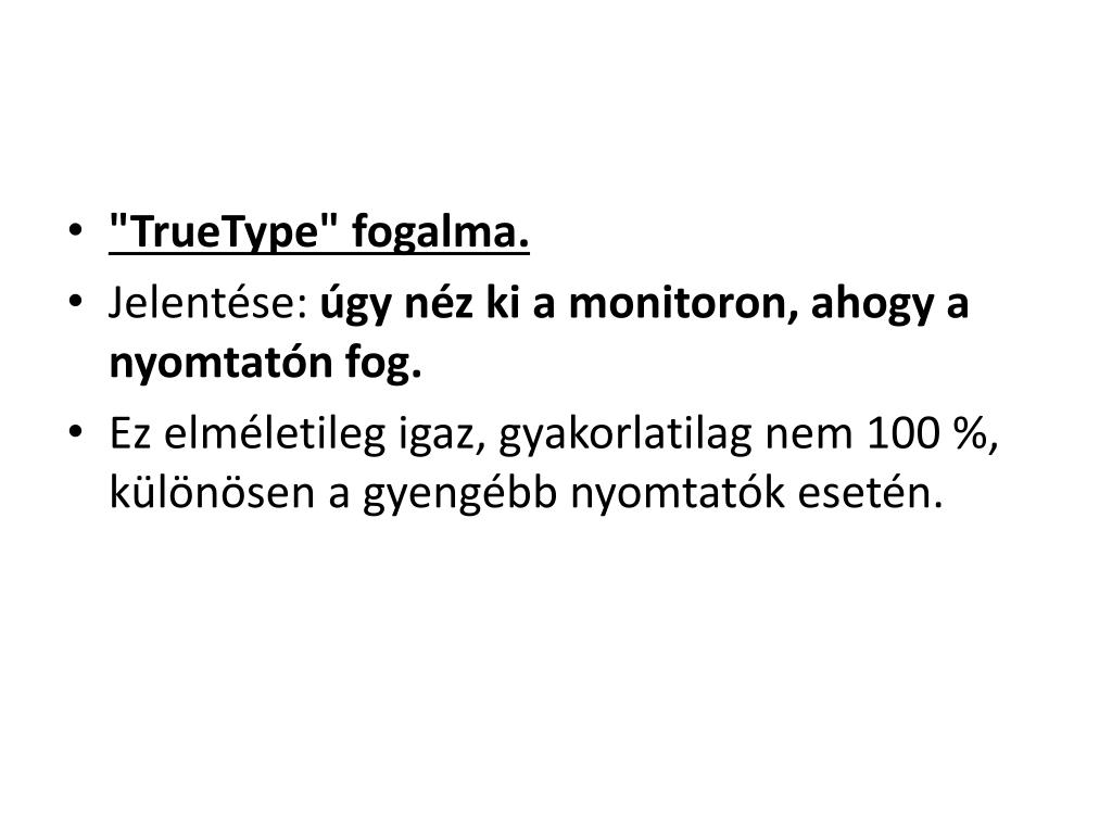 "TrueType" fogalma. • Jelentése: úgy néz ki a monitoron, ahogy a nyomtatón fog. • Ez elméletileg igaz, gyakorlatilag nem 100 %, különösen a gyengébb nyomtatók esetén.