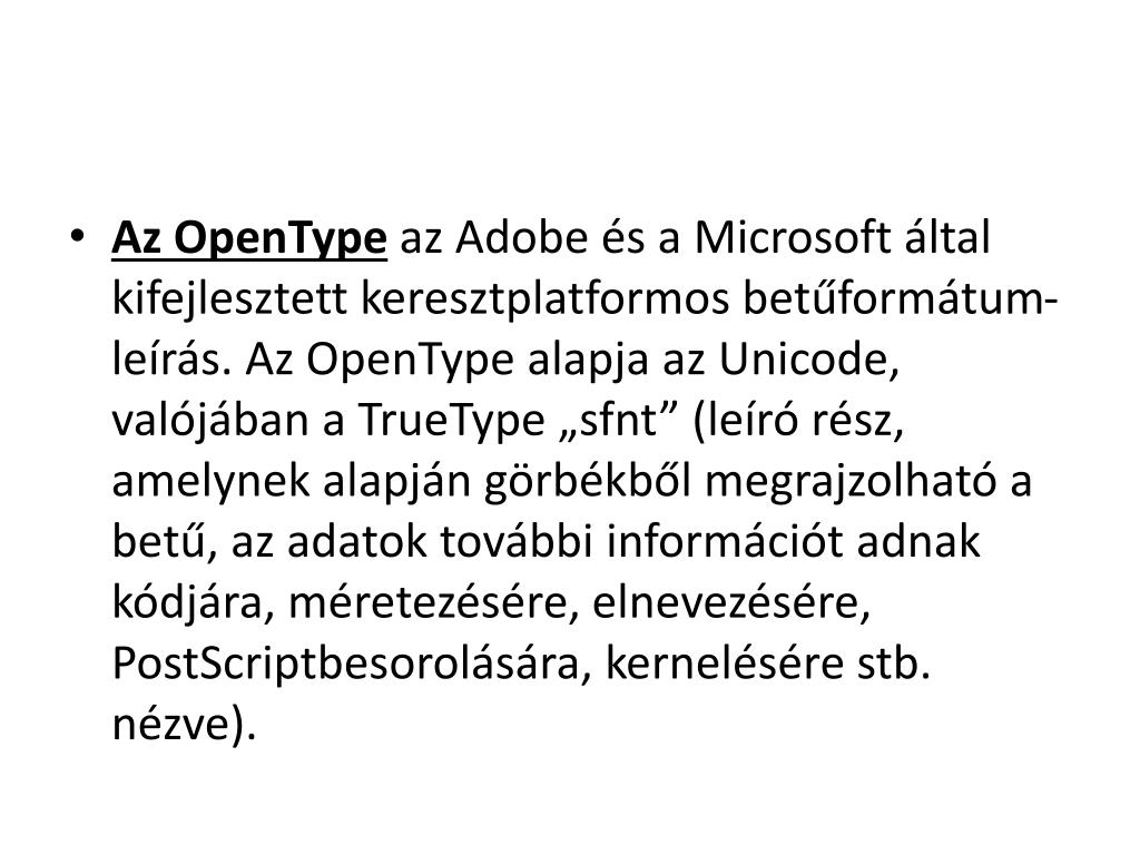 Formátumának továbbfejlesztett változata, amely támogatja a PostScript betűformátumot, és újabb tipográfiai beállításokat kínál. A TrueType betű .ttf vagy .ttc kiterjesztésű, amíg a PostScript alapú OpenType állomány .otf végződésű.