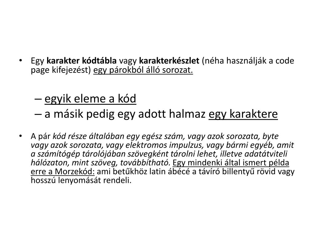 Karakter kódolás elve: • A számítógép és a külvilág, vagy egy másik számítógép közötti kapcsolat megvalósítása során az információk átvitele kódolva történik. A bitcsoportoknak - amelyek elvileg tetszőleges számú bitből állhatnak - jelentést tulajdonítunk akkor kódolást végzünk. • Az információátvitele során ezeket a bitcsoportokat továbbítjuk és a vevő oldalon a jelentésének megfelelően értelmezzük (dekódoljuk).