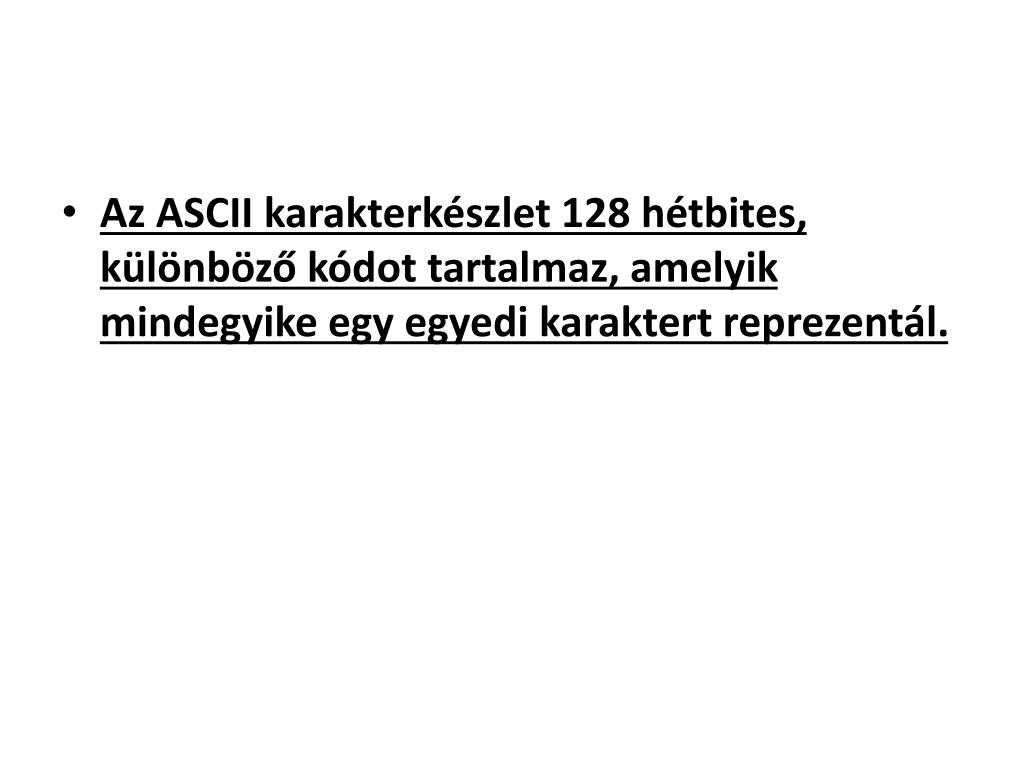Az ASCII KódrendszerAmerican Standard Code for Information Interchange • Az ASCII, amely betűk, számok és más szimbólumokhoz rendelt integer, amelyet egy 7-bites bináris számként értelmez. Általában ezt a 7-bites számot kiegészítik egy külön 0 bittel, így 8-bites byte formában tárolják, és kezelik.