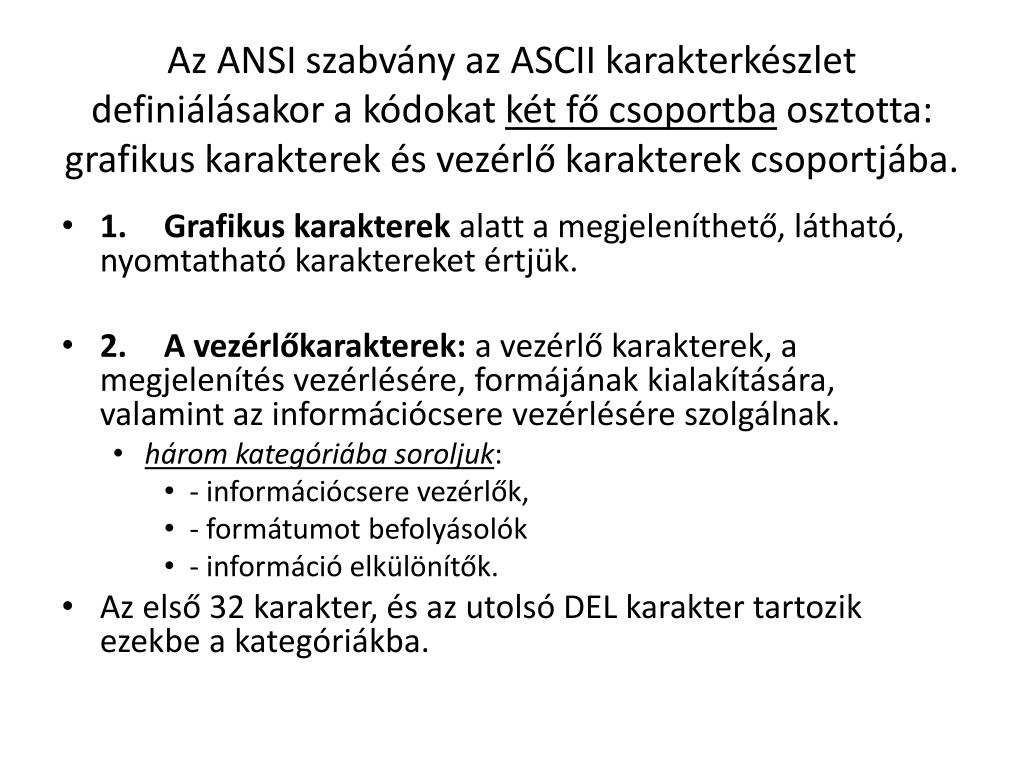 Az ANSI szabvány az ASCII karakterkészlet definiálásakor a kódokat két fő csoportba osztotta: grafikus karakterek és vezérlő karakterek csoportjába. • 1. Grafikus karakterek alatt a megjeleníthető, látható, nyomtatható karaktereket értjük. • 2. A vezérlőkarakterek: a vezérlő karakterek, a megjelenítés vezérlésére, formájának kialakítására, valamint az információcsere vezérlésére szolgálnak. • három kategóriába soroljuk: • - információcsere vezérlők, • - formátumot befolyásolók • - információ elkülönítők. • Az első 32 karakter, és az utolsó DEL karakter tartozik ezekbe a kategóriákba.