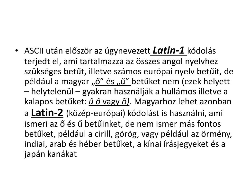 Legelterjedtebb kódolásai • (UTF - Unicode Transformation Format) • UTF32 -4 bájtos (32 bites) • UTF16- 16 v. 32 bites (változó hosszúságú) • UTF8- 8 bites
