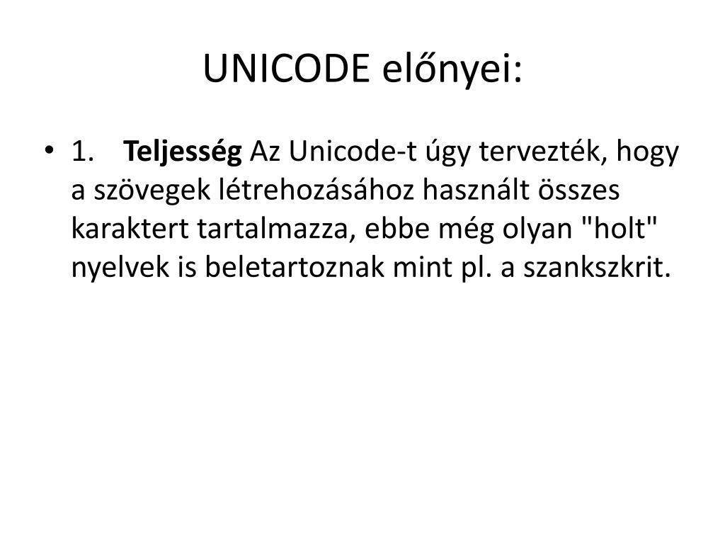 UNICODE előnyei: • 1. Teljesség Az Unicode-t úgy tervezték, hogy a szövegek létrehozásához használt összes karaktert tartalmazza, ebbe még olyan "holt" nyelvek is beletartoznak mint pl. a szankszkrit.