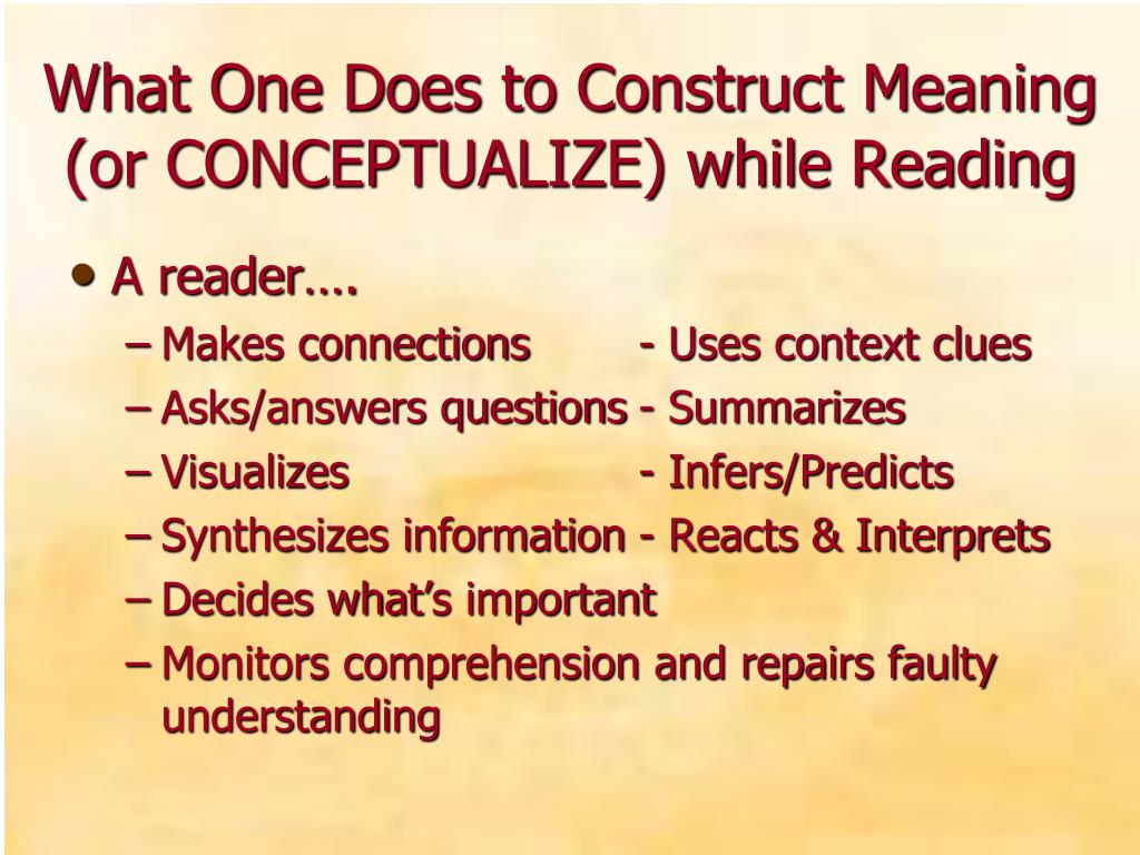 What One Does to Construct Meaning (or CONCEPTUALIZE) while Reading • A reader…. • Makes connections - Uses context clues • Asks/answers questions - Summarizes • Visualizes - Infers/Predicts • Synthesizes information - Reacts & Interprets • Decides what’s important • Monitors comprehension and repairs faulty understanding