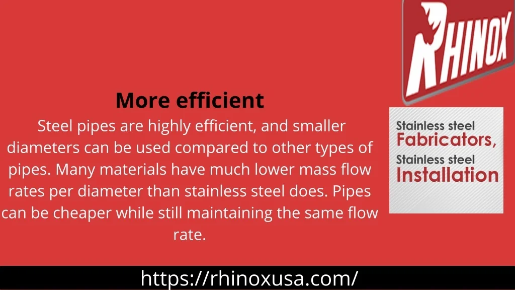 More efficient Steel pipes are highly efficient, and smaller diameters can be used compared to other types of pipes. Many materials have much lower mass flow rates per diameter than stainless steel does. Pipes can be cheaper while still maintaining the same flow rate. https://rhinoxusa.com/