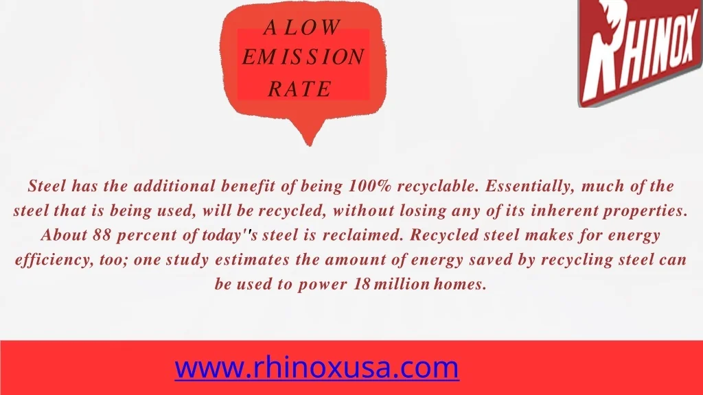 ALOW EMISSION RATE Steel has the additional benefit of being 100% recyclable. Essentially, much of the steelthatisbeingused,willberecycled,withoutlosinganyofitsinherentproperties. About 88 percent of today''s steel is reclaimed. Recycled steel makes for energy efficiency,too;onestudyestimatestheamountofenergysavedbyrecyclingsteelcan be used to power 18 millionhomes. www.rhinoxusa.com