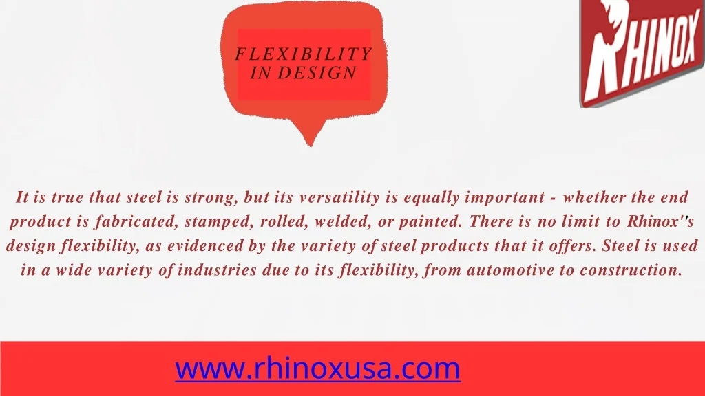 FLEXIBILITY INDESIGN Itistruethatsteelisstrong,butitsversatilityisequallyimportant-whethertheend product is fabricated, stamped, rolled, welded, or painted. There is no limit to Rhinox''s designflexibility,asevidencedbythevarietyofsteelproductsthatitoffers.Steelisused inawidevarietyofindustriesduetoitsflexibility,fromautomotivetoconstruction. www.rhinoxusa.com