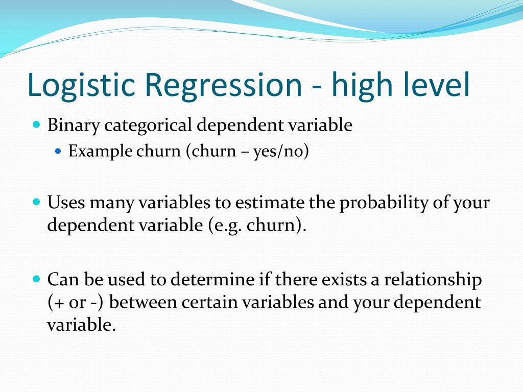 Logistic Regression - high level • Binary categorical dependent variable • Example churn (churn – yes/no) • Uses many variables to estimate the probability of your dependent variable (e.g. churn). • Can be used to determine if there exists a relationship (+ or -) between certain variables and your dependent variable.