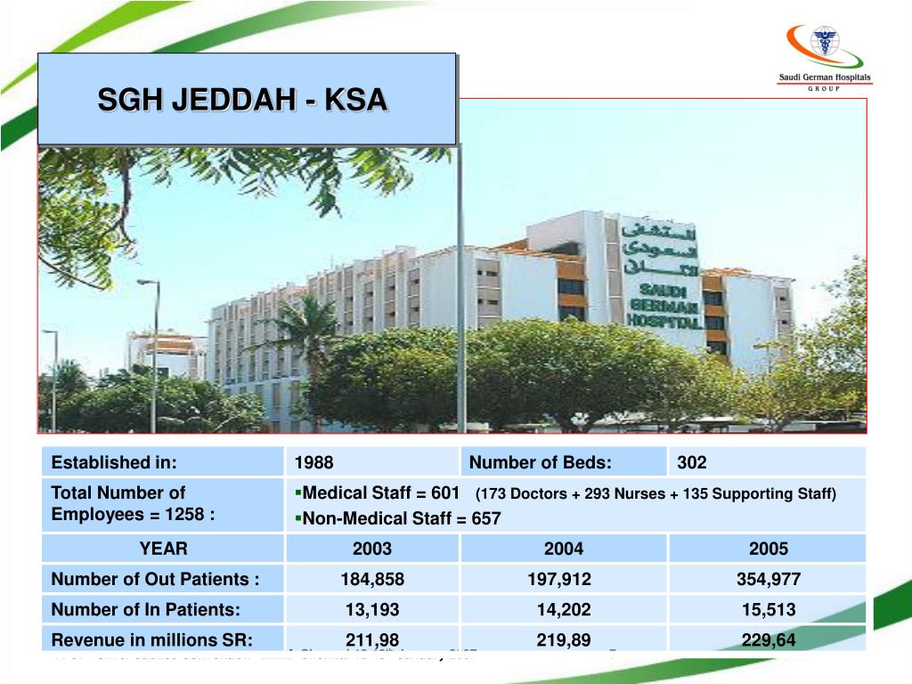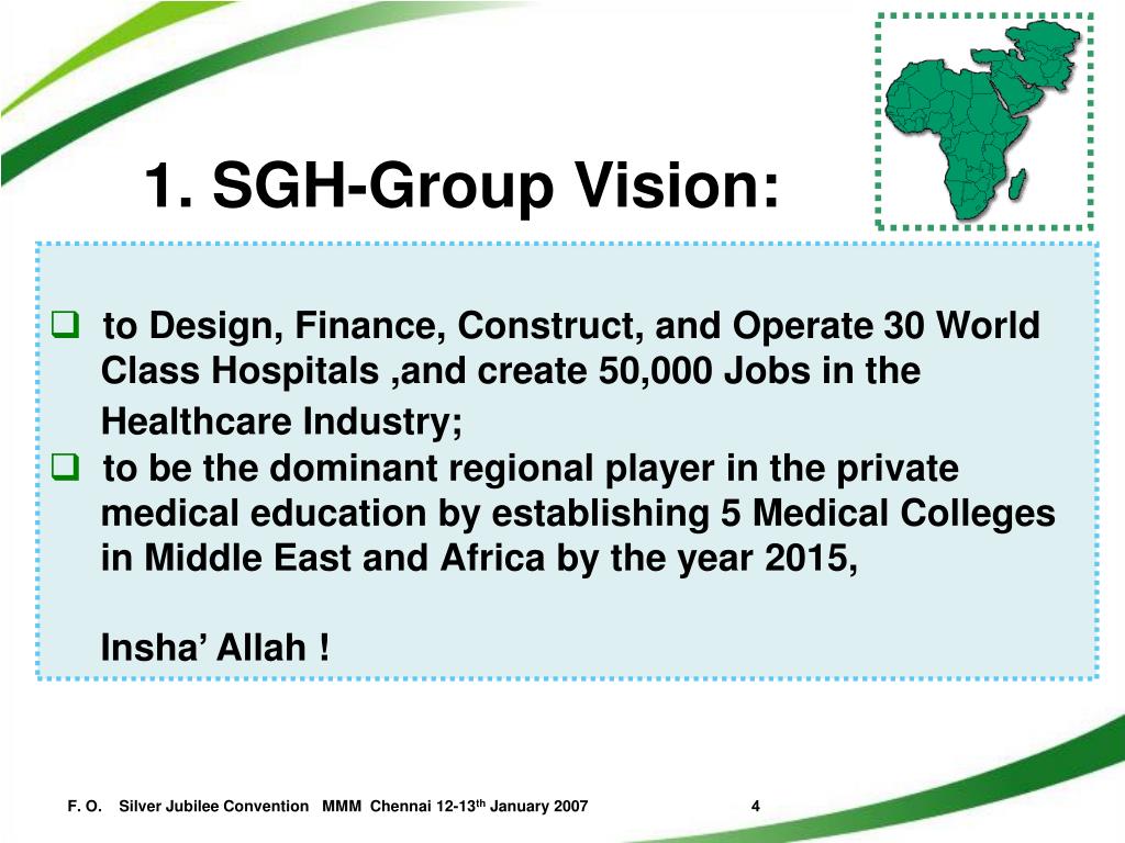 1. SGH-Group Vision: • to Design, Finance, Construct, and Operate 30 World Class Hospitals ,and create 50,000 Jobs in the Healthcare Industry; • to be the dominant regional player in the private medical education by establishing 5 MedicalColleges in Middle East andAfrica by the year 2015, Insha’ Allah !