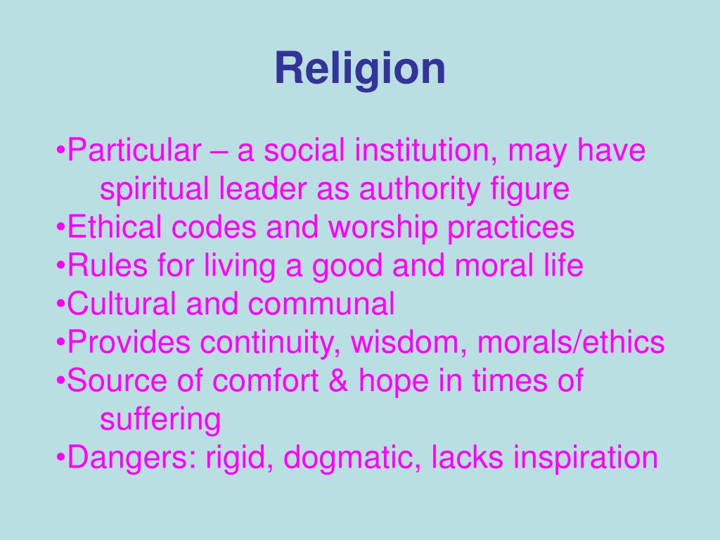 Religion • Particular – a social institution, may have • spiritual leader as authority figure • Ethical codes and worship practices • Rules for living a good and moral life • Cultural and communal • Provides continuity, wisdom, morals/ethics • Source of comfort & hope in times of • suffering • Dangers: rigid, dogmatic, lacks inspiration